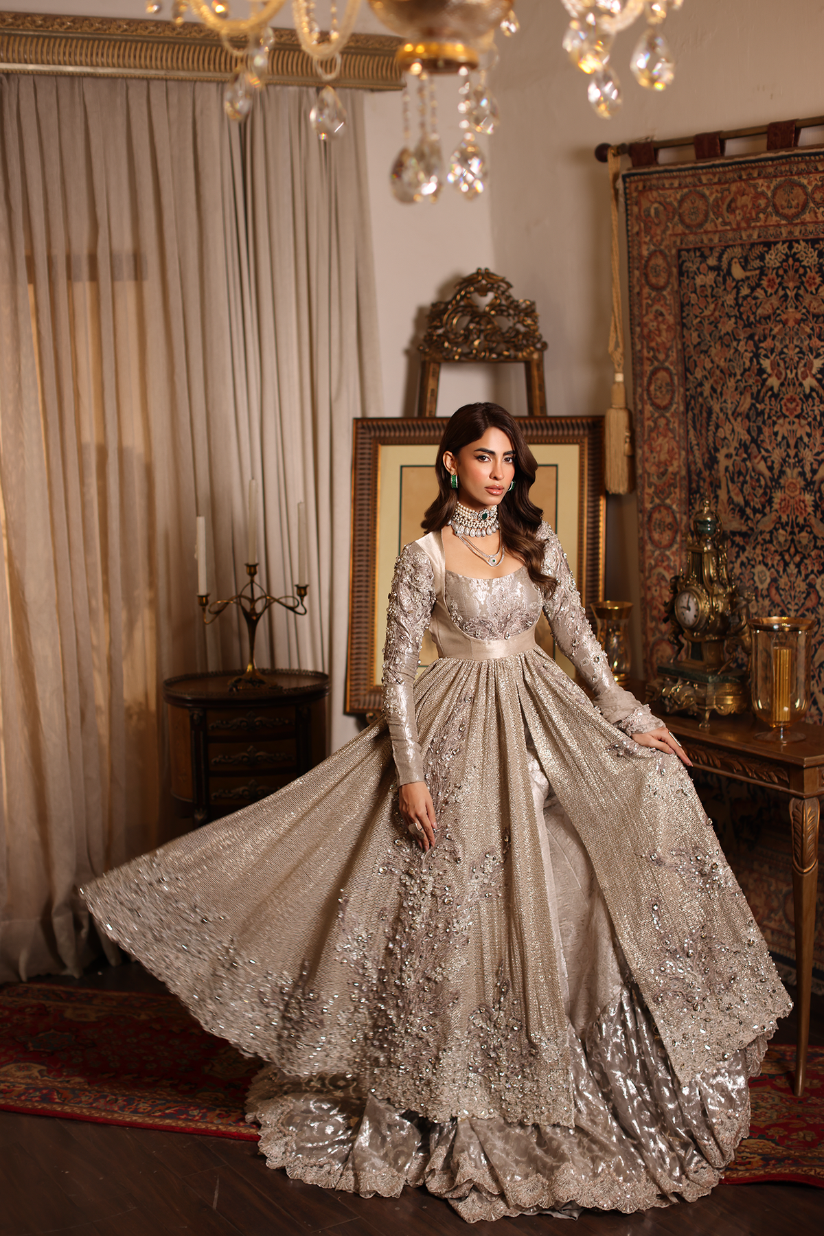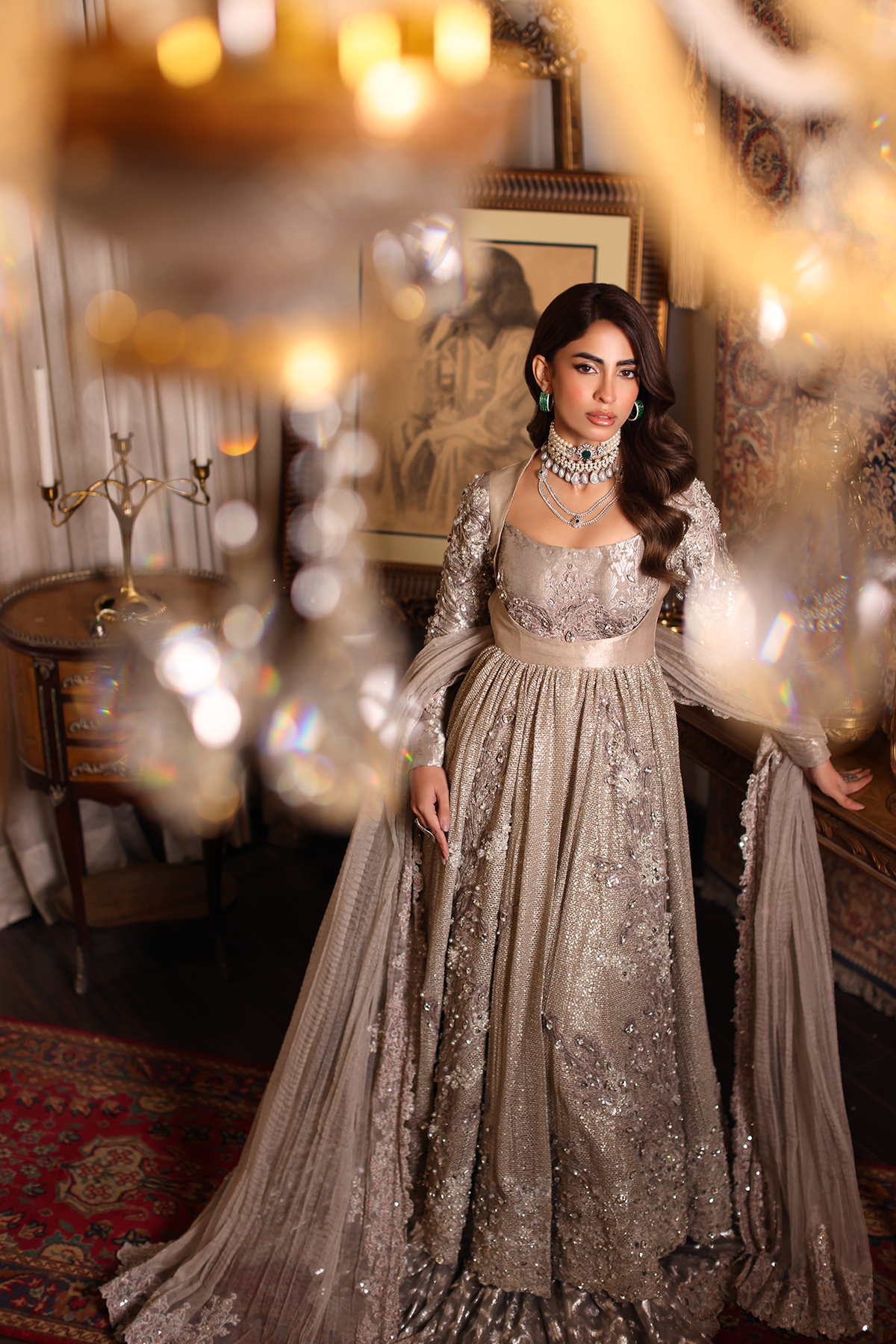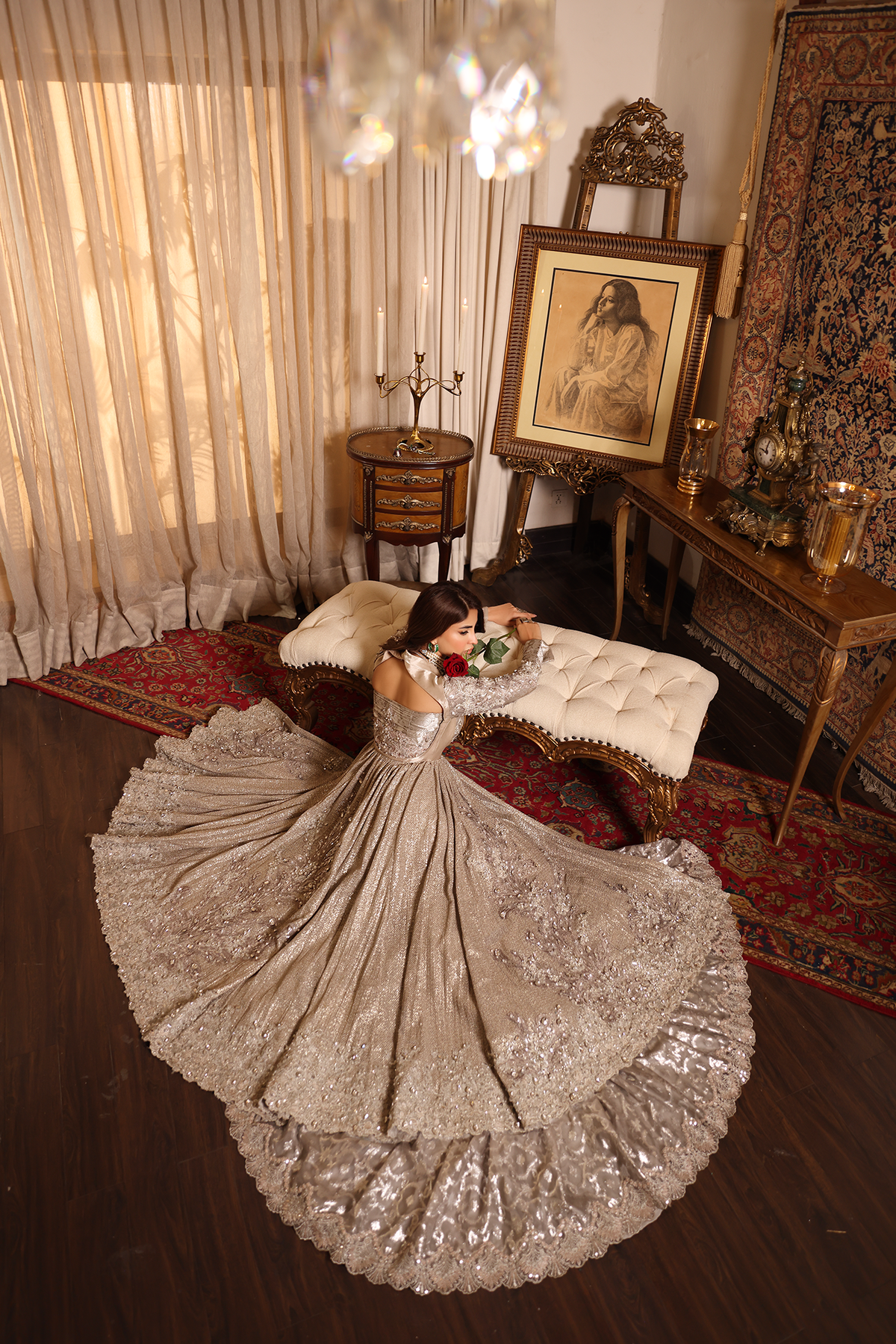 Lustre of the Moon is an ode to luminosity — a silver peshwas that glimmers with grace and movement. Intricately embroidered and hand-embellished, the design captures the soft radiance of moonlight cascading over couture hand craftsmanship. Each element is carefully constructed, creating a piece that is both ethereal and timeless — a true expression of modern regality. Extensive research and hours of meticulous handwork by Musferah Saad’s atelier lend this design its couture finesse — timeless, radiant, and impossibly chic.