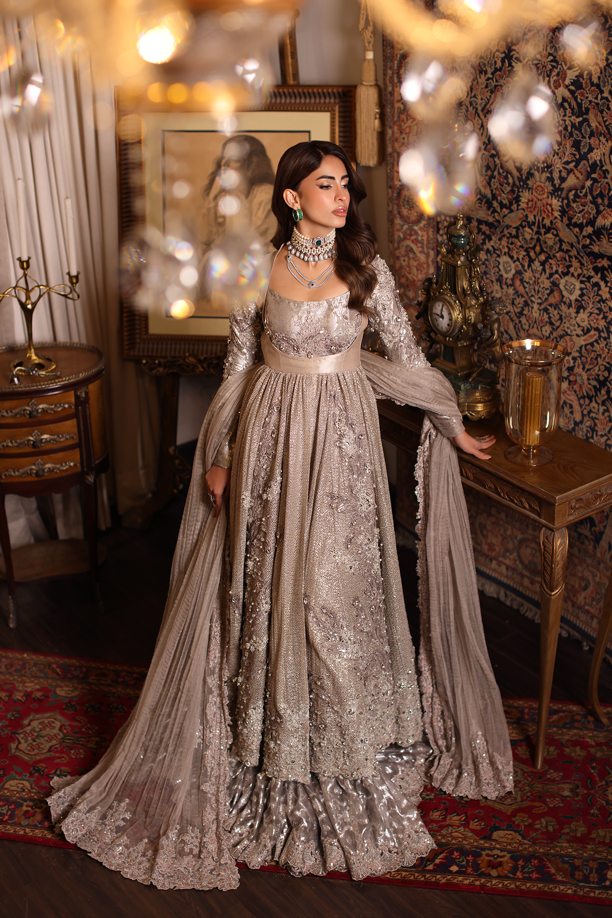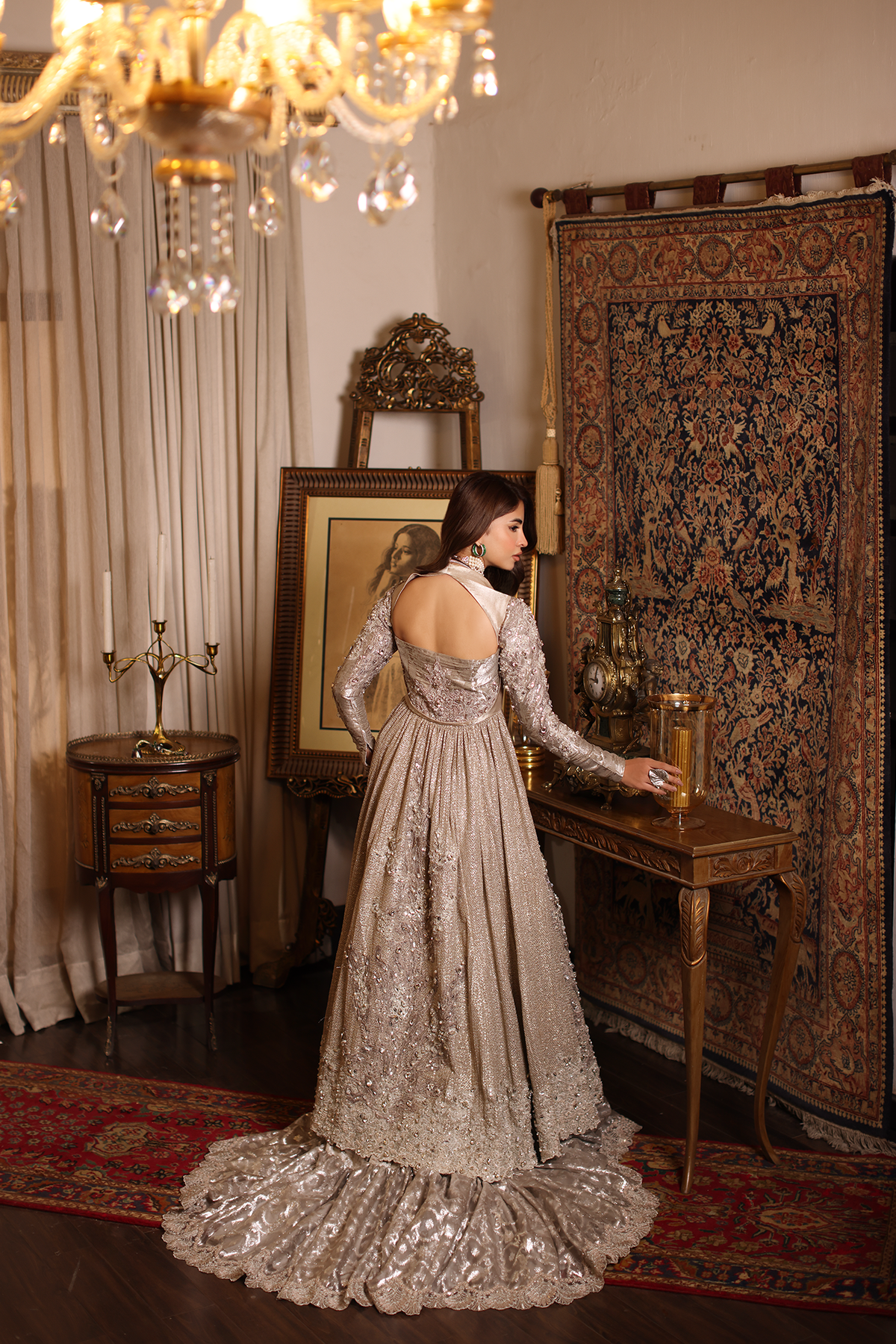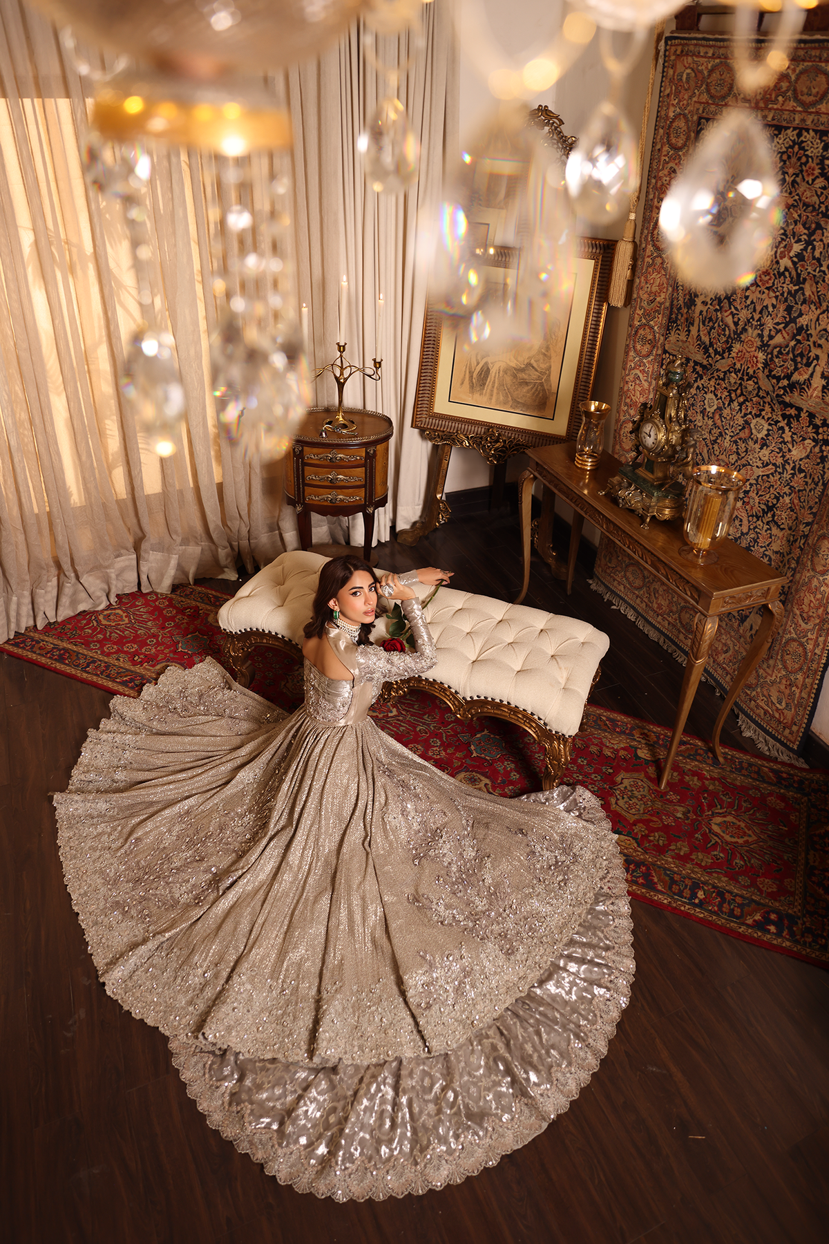 Lustre of the Moon is an ode to luminosity — a silver peshwas that glimmers with grace and movement. Intricately embroidered and hand-embellished, the design captures the soft radiance of moonlight cascading over couture hand craftsmanship. Each element is carefully constructed, creating a piece that is both ethereal and timeless — a true expression of modern regality. Extensive research and hours of meticulous handwork by Musferah Saad’s atelier lend this design its couture finesse — timeless, radiant, and impossibly chic.