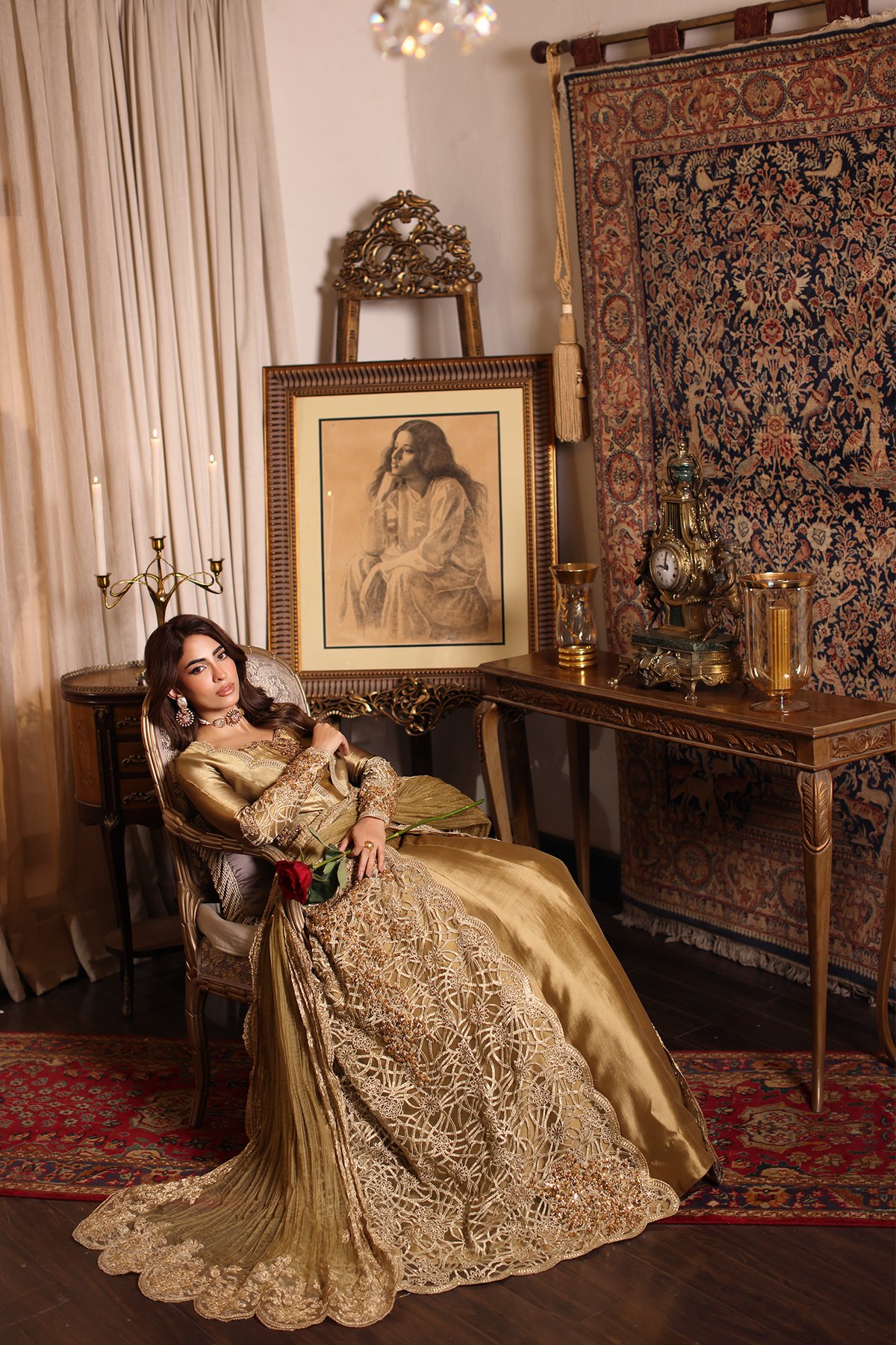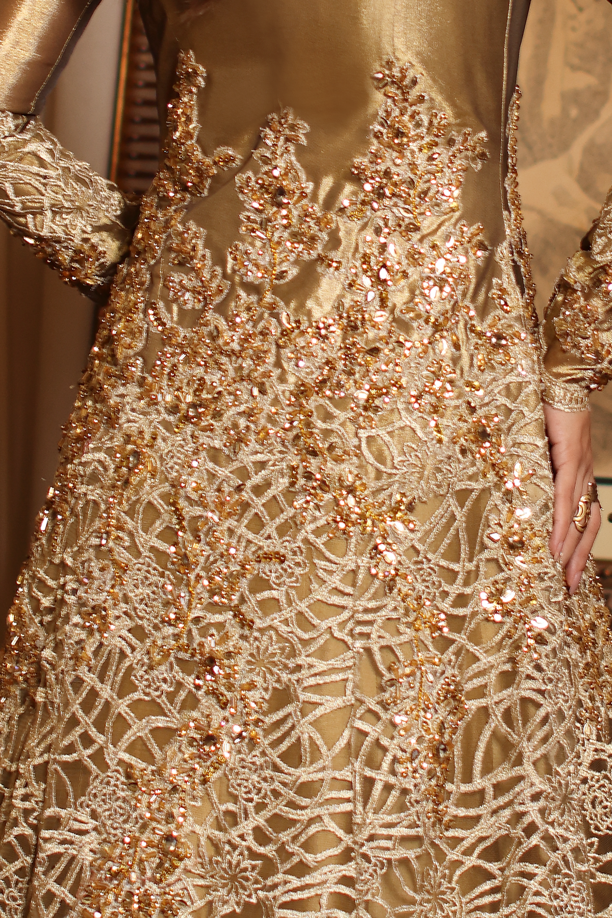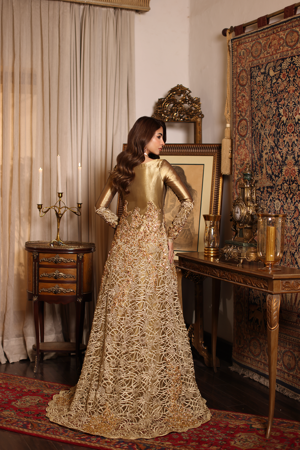 Sunlit Grace evokes the golden warmth of daylight woven into couture. The silhouette reflects refined tailoring with delicate embellishment, blending tradition with effortless sophistication. Intricate gold tilla and resham embroidery illuminate the design, creating a glowing harmony of texture and elegance. Each element, from stitch to shimmer, is shaped through painstaking handwork — a radiant expression of modern regality.