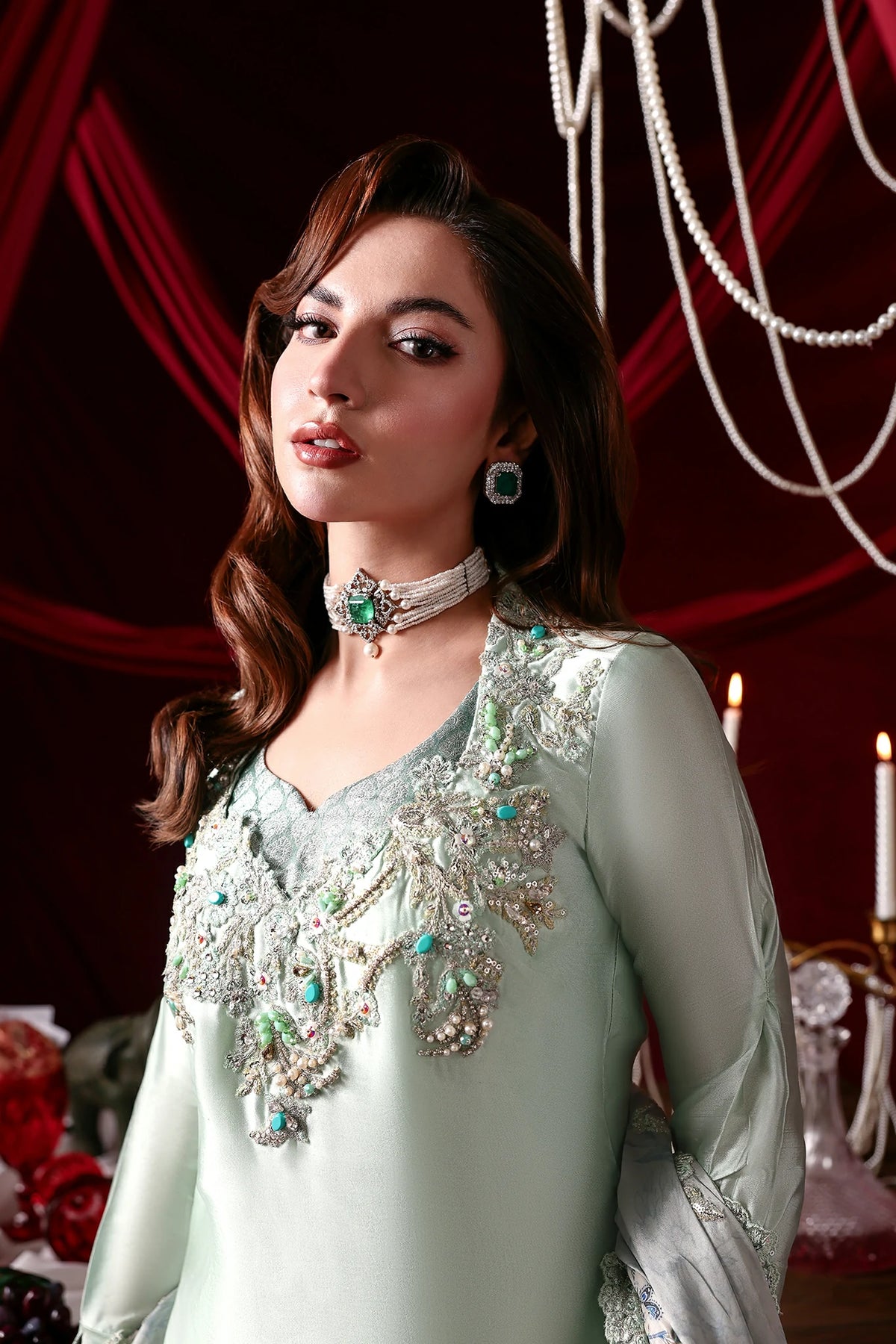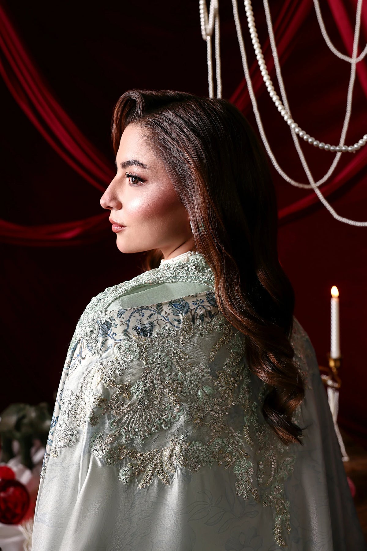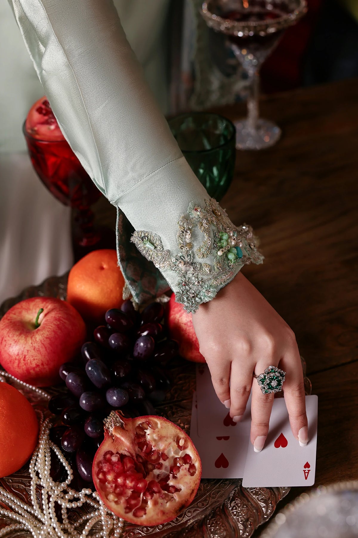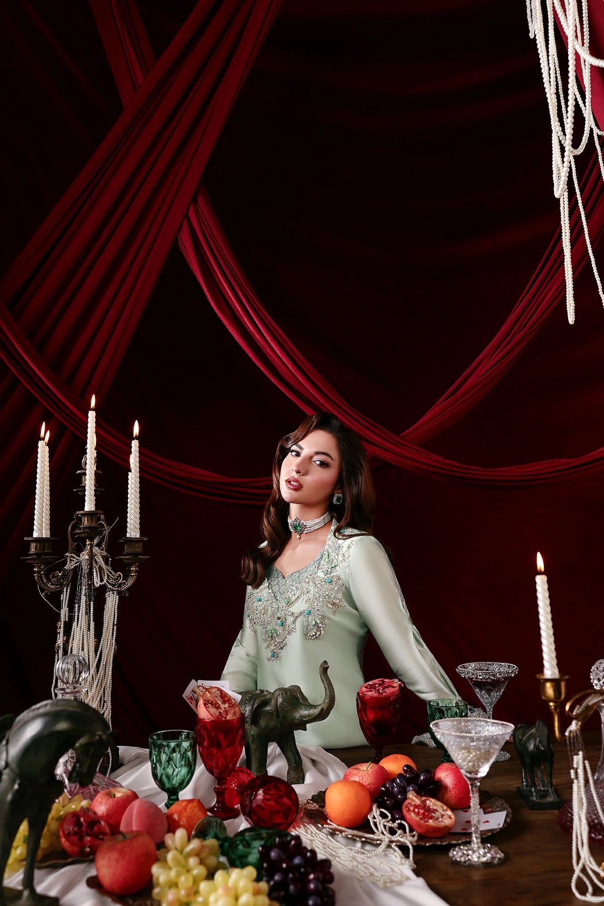 "With Elysia, I wanted the wearer to feel like they are stepping out of a classical painting. The Pistachio Mint silk acts as a second skin, while the hand-embellishments add that sharp, high-fashion edge I strive for in every Ensemble." — Musferah Saad