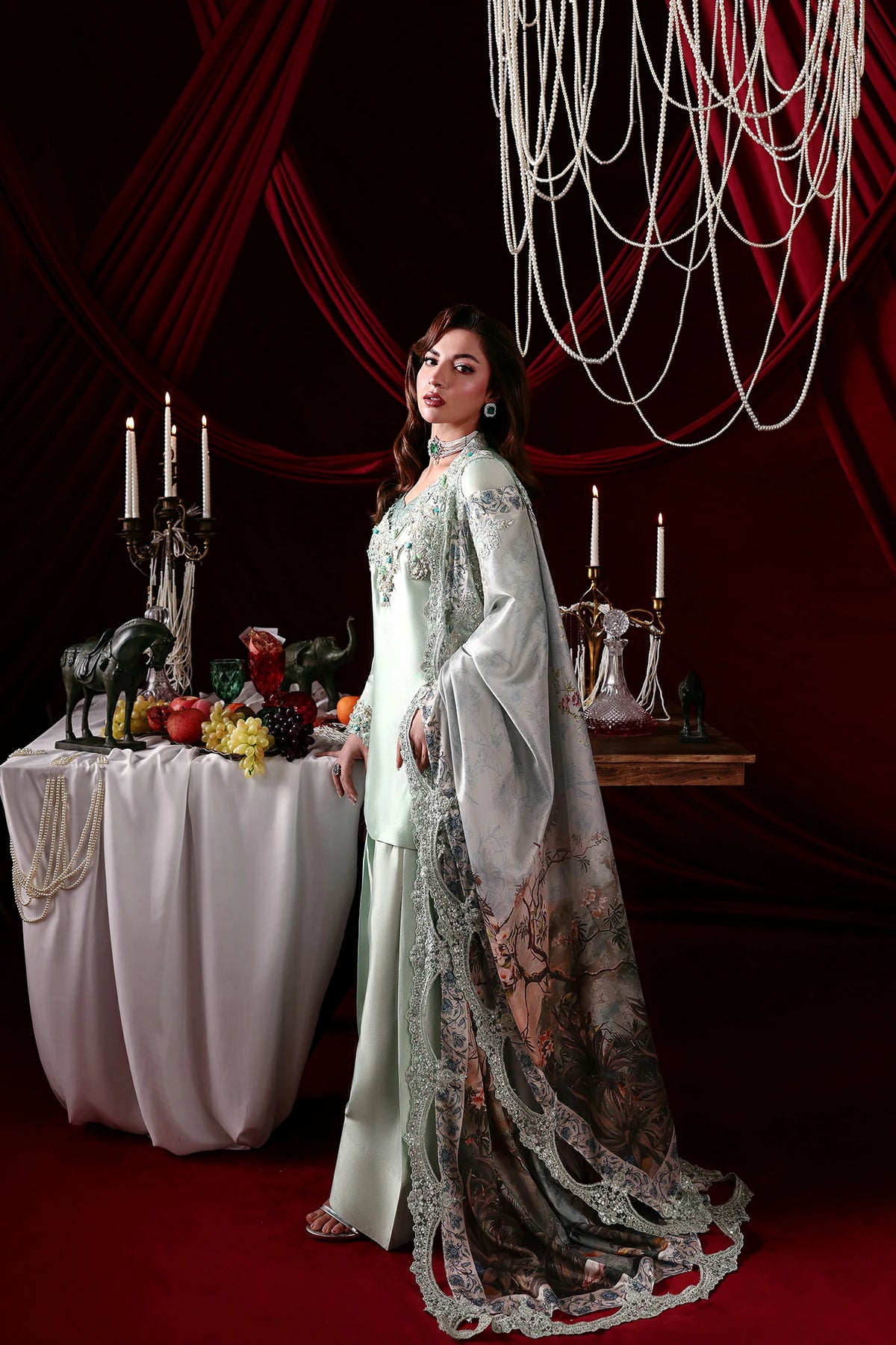 Musferah Saad’s design process for Elysia involved months of couture research, especially Parisian in nature. This dedication is evident in sublime handworked neckline and especially the royal scenic print dupatta, which serves as a canvas for a delicate garden of birds, flora, and fauna—meticulously framed by a four-sided resham and tilla embroidered border that adds a regal weight to the airy fabric.