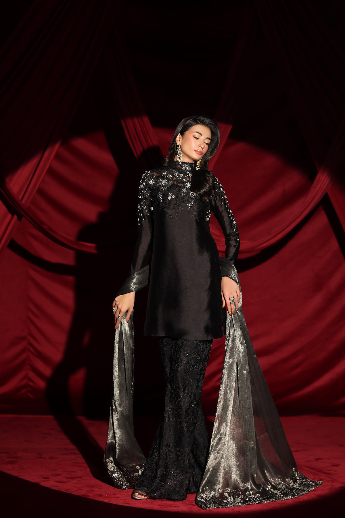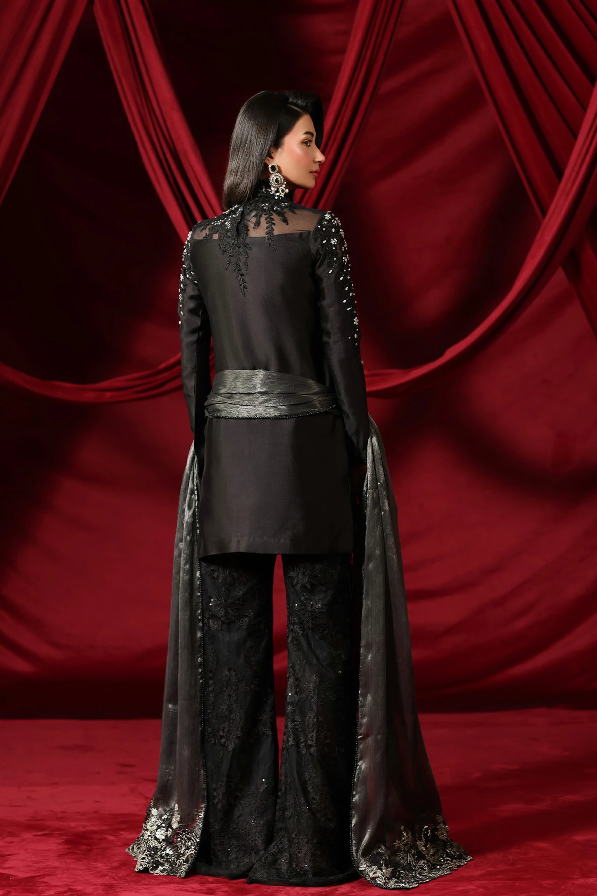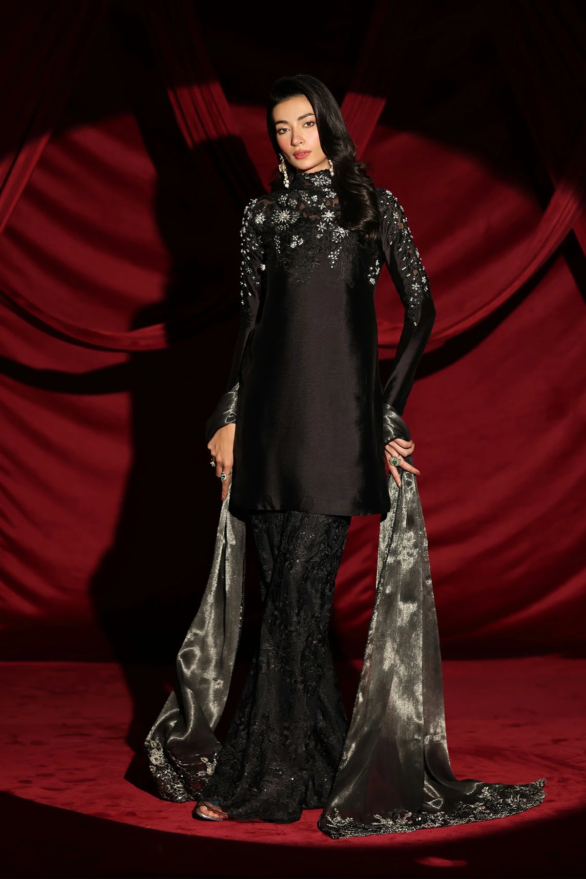 "With Midnight Seduction, I wanted to capture the essence of a shadow brought to life. The pure tissue silk in our signature Midnight Black provides a seductive, liquid-like glow, while the cut dana work and resham-embroidered bootcut pants add that sharp, chic edge I strive for. It is a dress for the woman who is her own source of mystery." — Musferah Saad