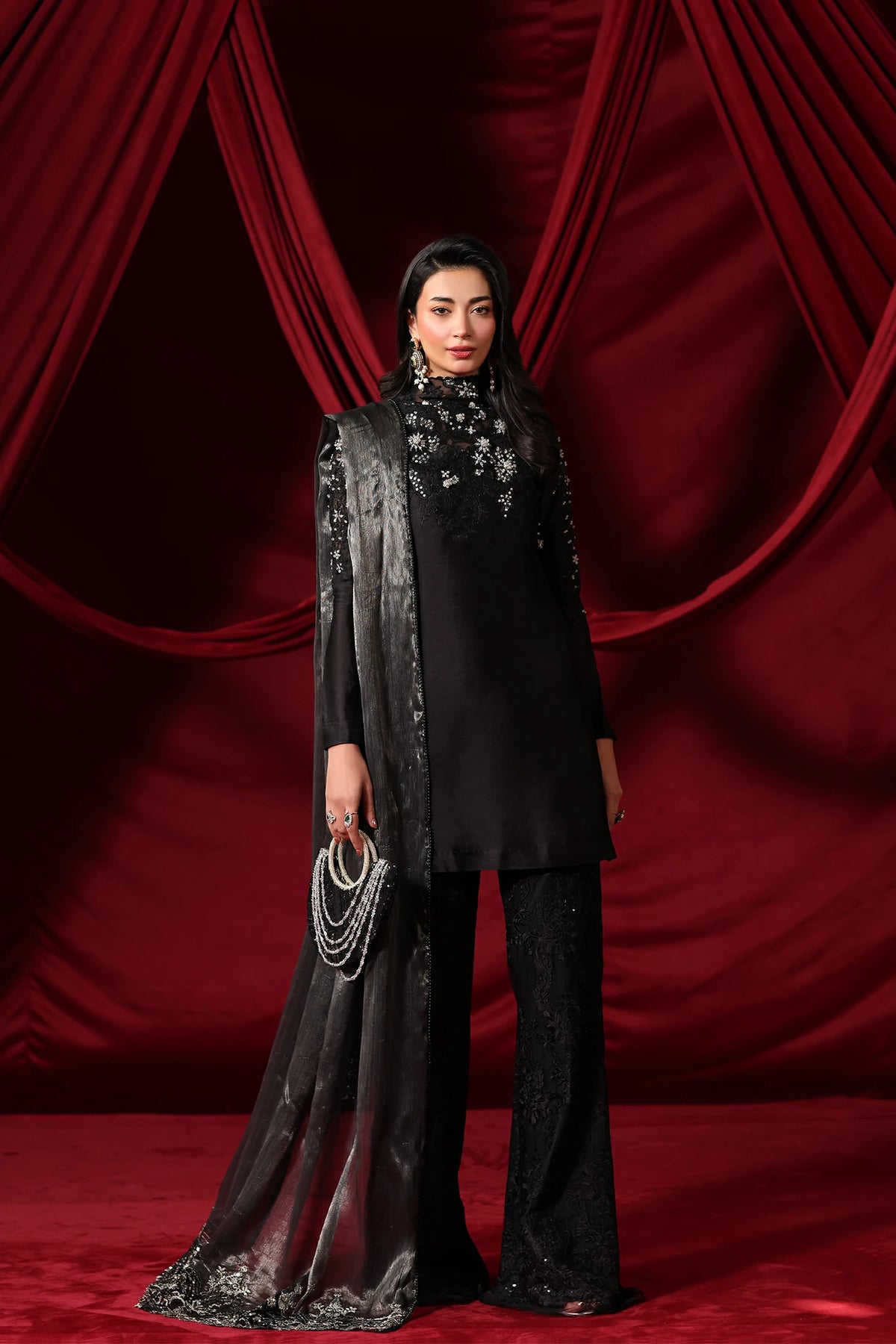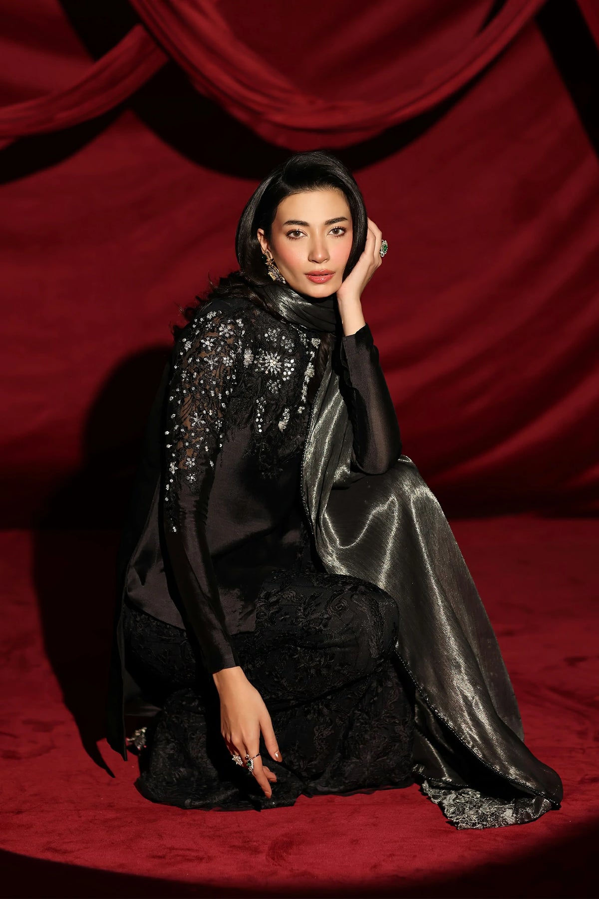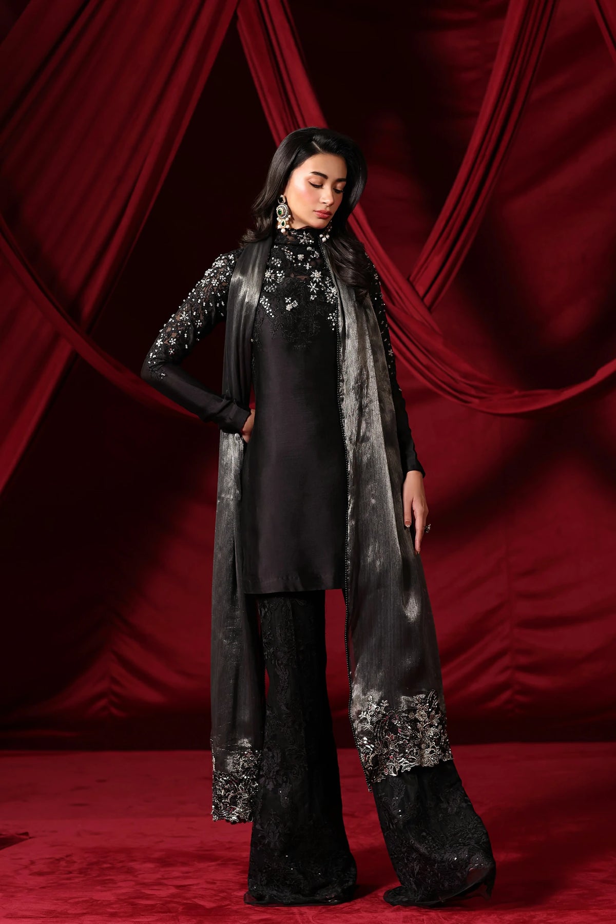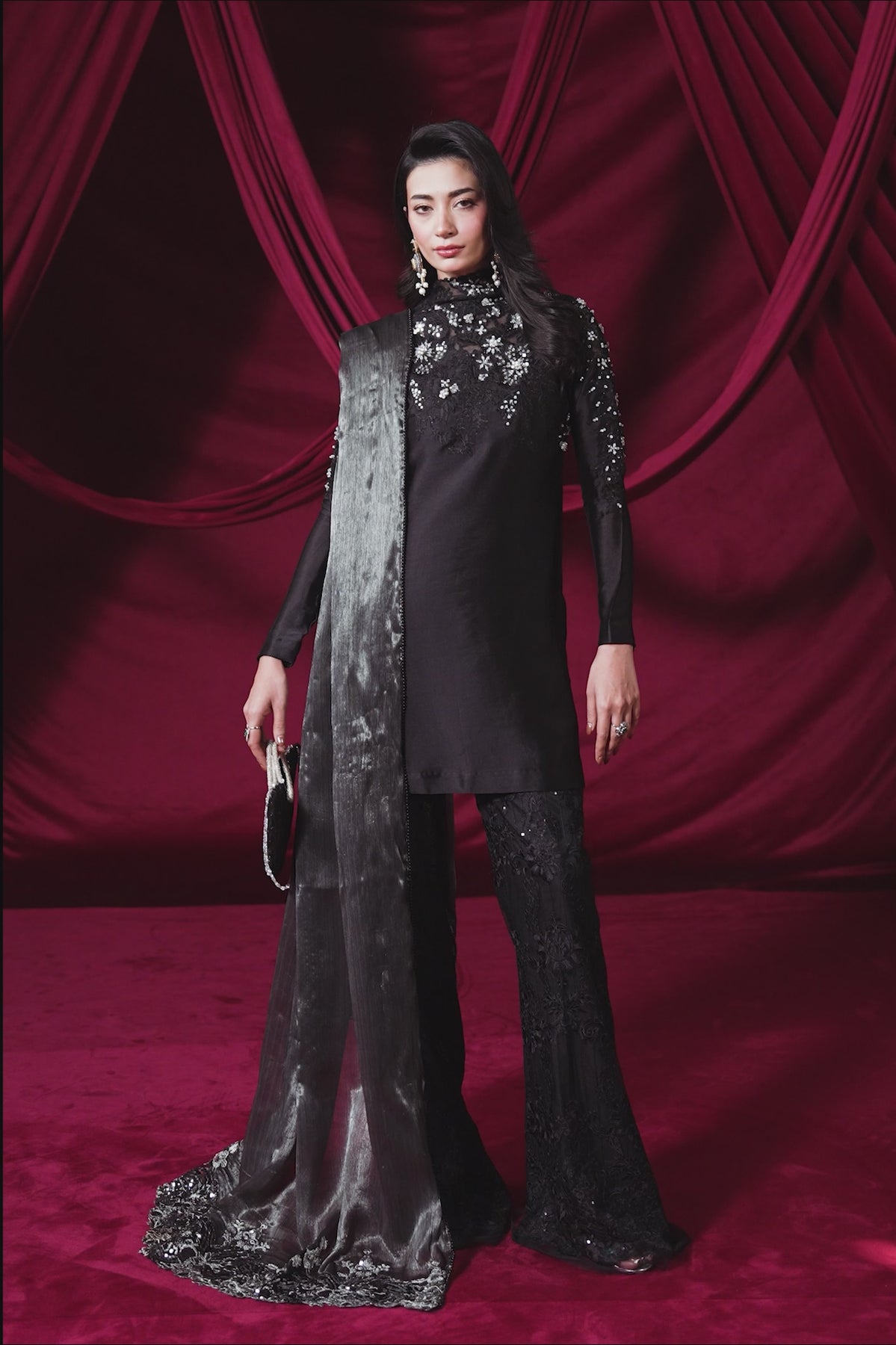"With Midnight Seduction, I wanted to capture the essence of a shadow brought to life. The pure tissue silk in our signature Midnight Black provides a seductive, liquid-like glow, while the cut dana work and resham-embroidered bootcut pants add that sharp, chic edge I strive for. It is a dress for the woman who is her own source of mystery." — Musferah Saad