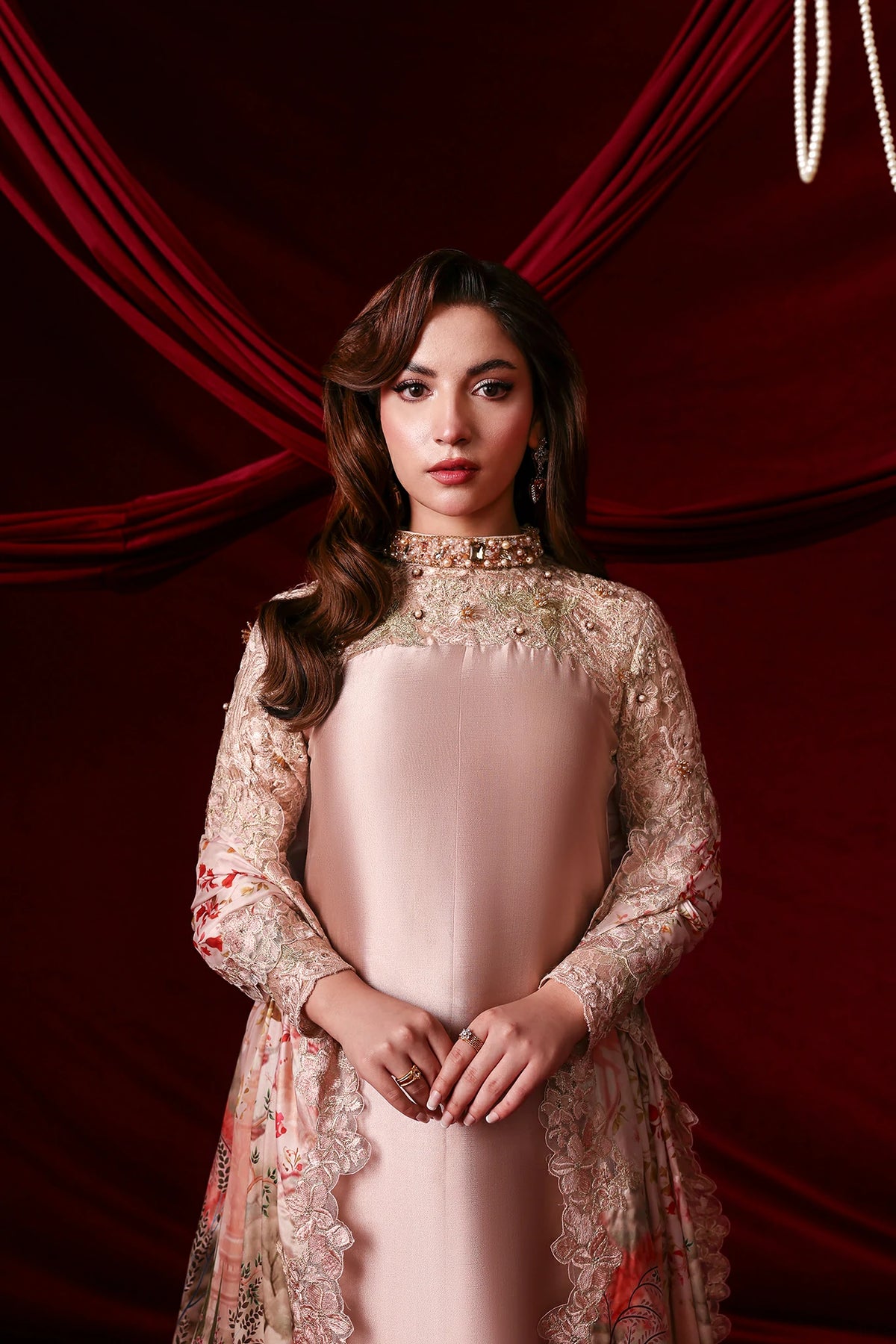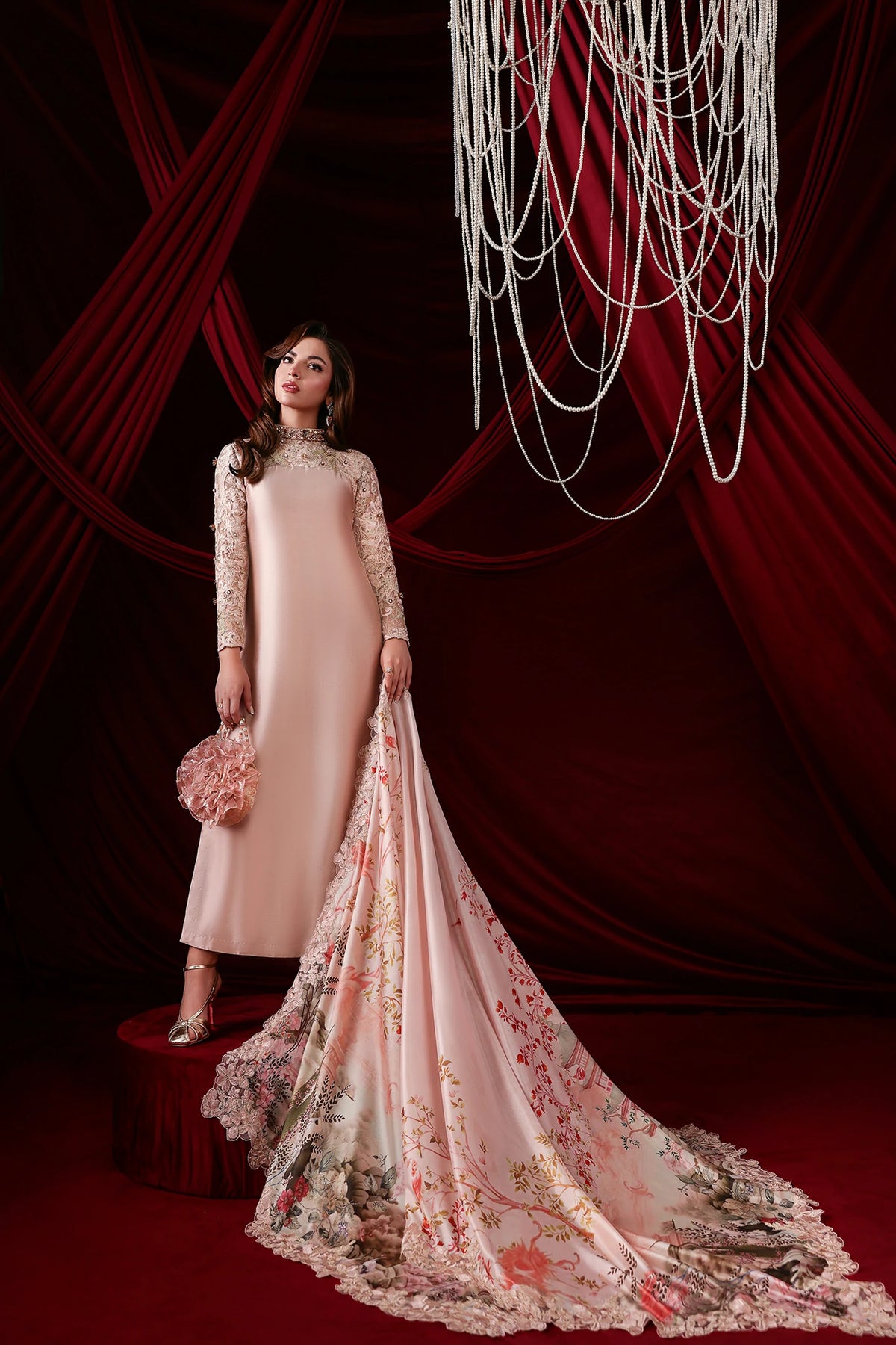 Rosaline is the quintessential expression of "Musferah Saad" glamour—a delicate, ethereal masterpiece that balances feminine grace with a sharp, modern edge. Drenched in a luminous Blush Champagne, the pure tissue silk has been meticulously sourced for its glass-like sheen, designed to capture the light and provide a statuesque,MS exclusive silhouette that gives chic effortlessly.