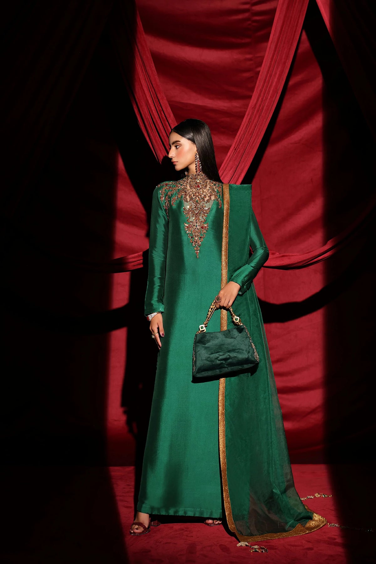 "With The Emerald Queen, I wanted to capture the depth of a royal gemstone. The pure tissue silk in our signature Royal Emerald provides a deep, liquid-like glow, while the antique dori work and gorgeous handwork add that sharp, chic edge I strive for. It is a dress for the woman who is her own source of power." — Musferah Saad