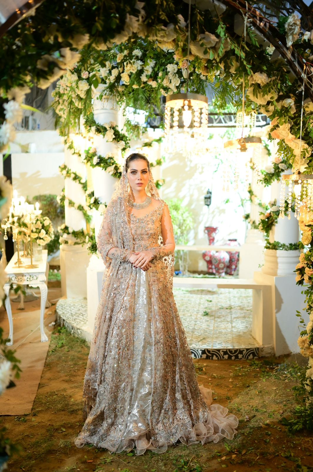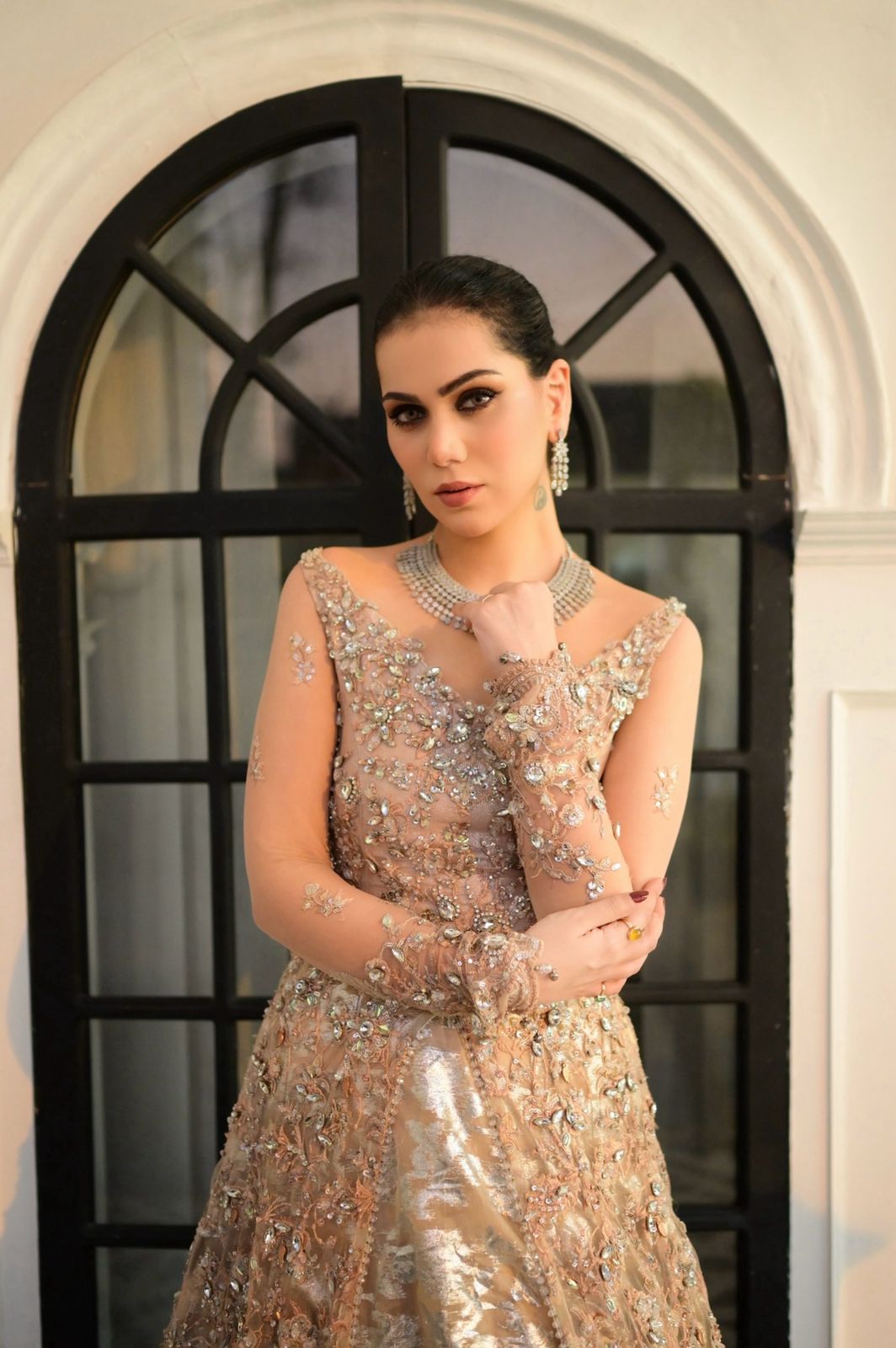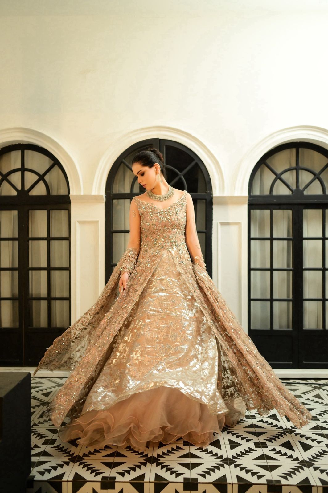 Experience the mystical allure of ‘Moonlit Romance,’ a breathtaking testament to couture craftsmanship. This stunning front-open gown is adorned with intricate rose gold and silver tilla embroidery, embellished with antique rose gold leaves and sparkling rhinestones. A mesmerizing mix of sequins, tubes, and pipes adds dynamic texture, while a tinsel tissue bodice lining ensures both comfort and sophistication. It’s a true statement piece designed for the modern muse.