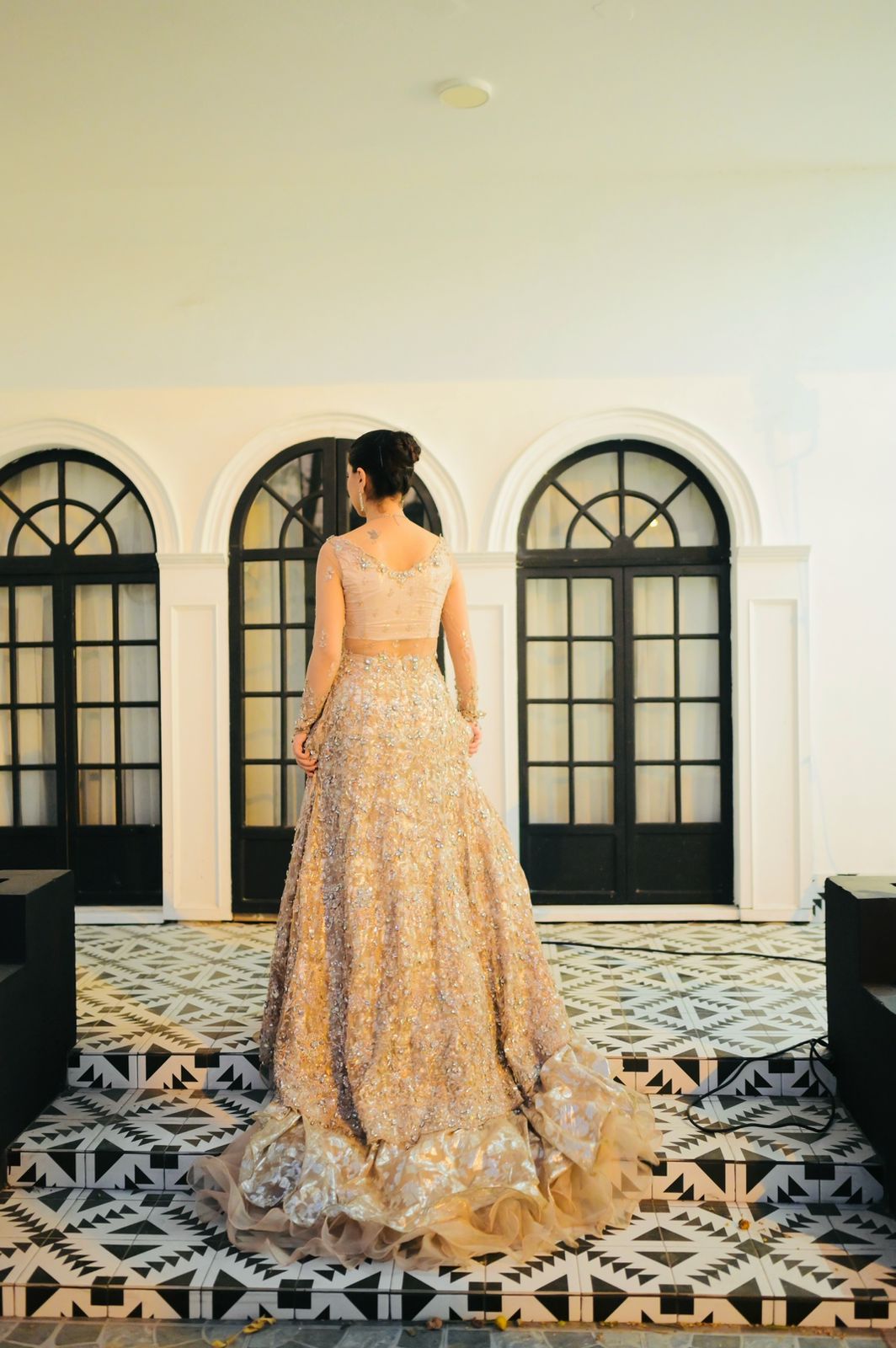 Paired with a luxurious lehenga featuring a rose gold base adorned with intricate silver tilla motifs, it exudes timeless elegance. The design is beautifully enhanced by a flared tissue hem, adding fluidity and grace to every movement.