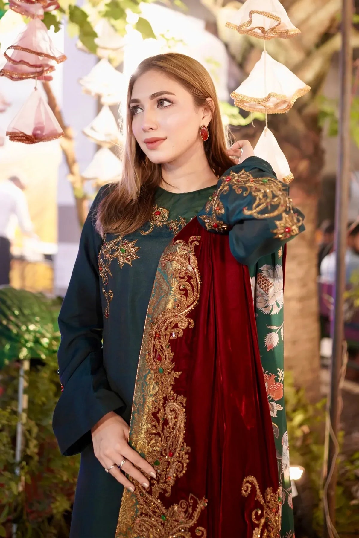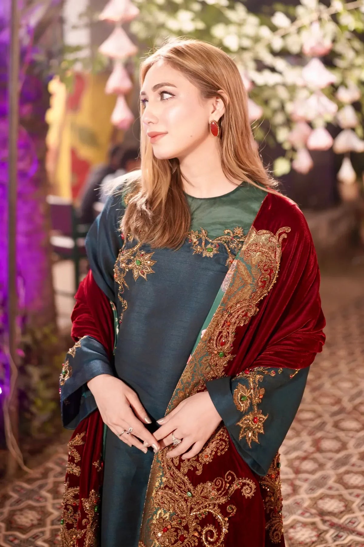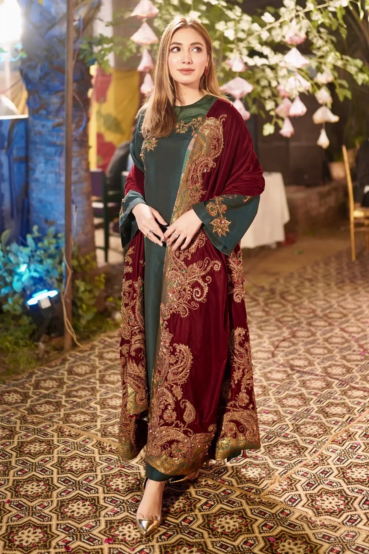 Experience the Pinnacle of sophistication with this magnificent velvet shawl, meticulously crafted to stand as a symbol of elegance and refinement. Brought to life with painstaking handwork, this piece is generously bespeckled with a harmonious blend of precious and semi-precious stones, encapsulating the creative vision of Musferah Saad. The Blooms of Paradise shawl unfolds in a regal tapestry of meticulously hand-embroidered motifs, woven into an opulent narrative of color and splendor.